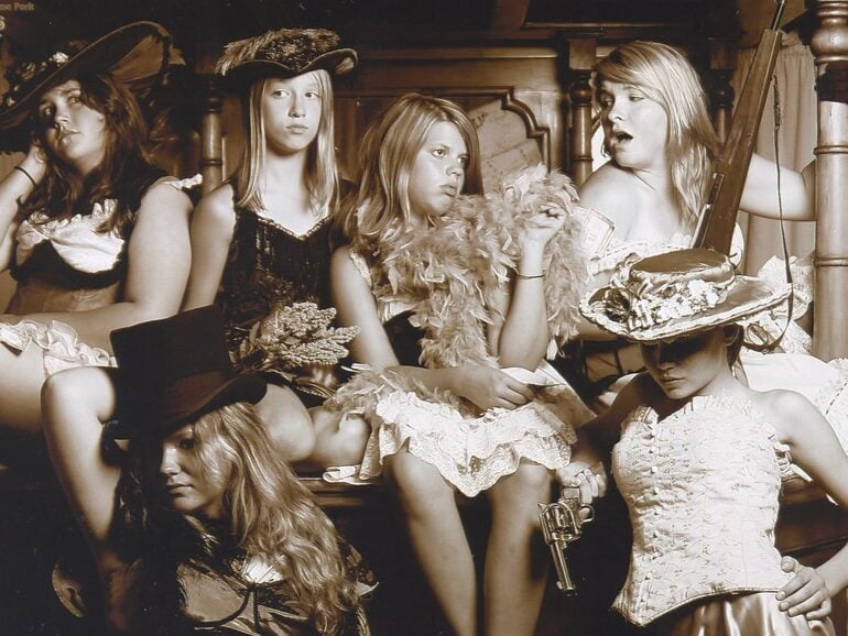 In photos from the California and Klondike rushes, you see women dressed in elaborate gowns that seem completely at odds with their surroundings — sawdust floors, plank ceilings, flickering oil lamps.