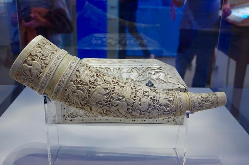 This carved elephant tusk horn from southern Italy, circa 1100, features intricate scenes of courtly life.