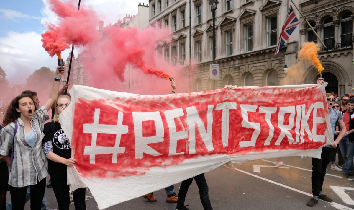 Rent Strike Banner on Tenement Building