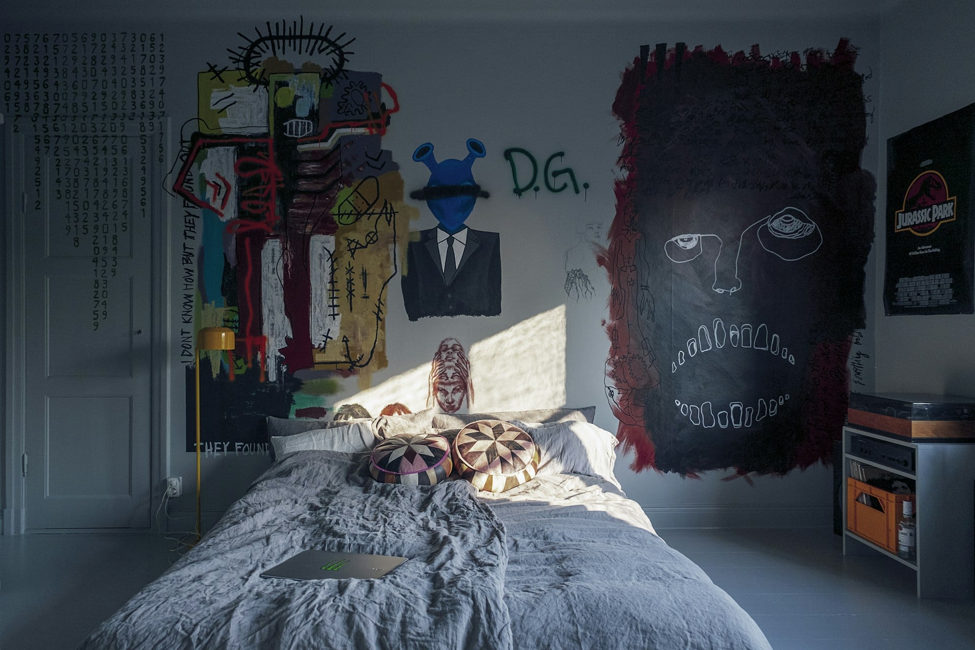 A single shade on the wall can whisper what year it is. Favorite musicians, players, or TV stories show up in posters hanging crooked or proud.