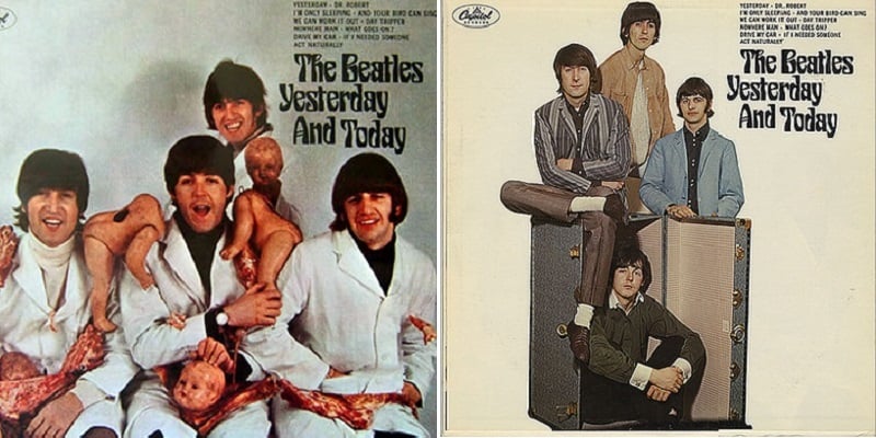 The Fab Four shocked America in 1966 with the cover for Yesterday and Today. Photographer Robert Whitaker captured the band wearing white butcher coats, surrounded by raw meat and dismembered doll parts.