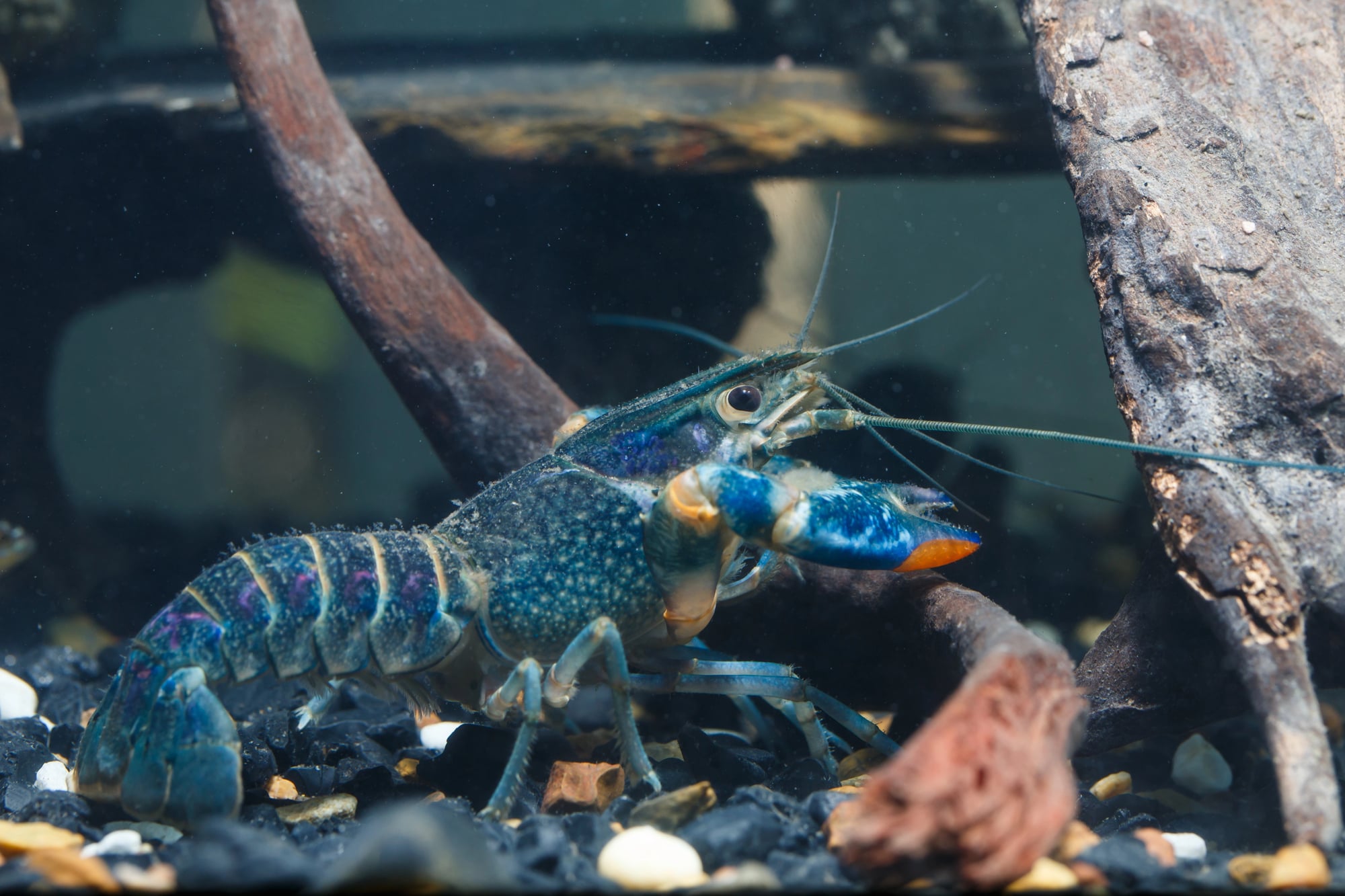 A bright blue lobster looks almost artificial, as though it were dipped in paint. The coloration comes from a genetic mutation that causes the lobster to produce an excessive amount of a particular protein.