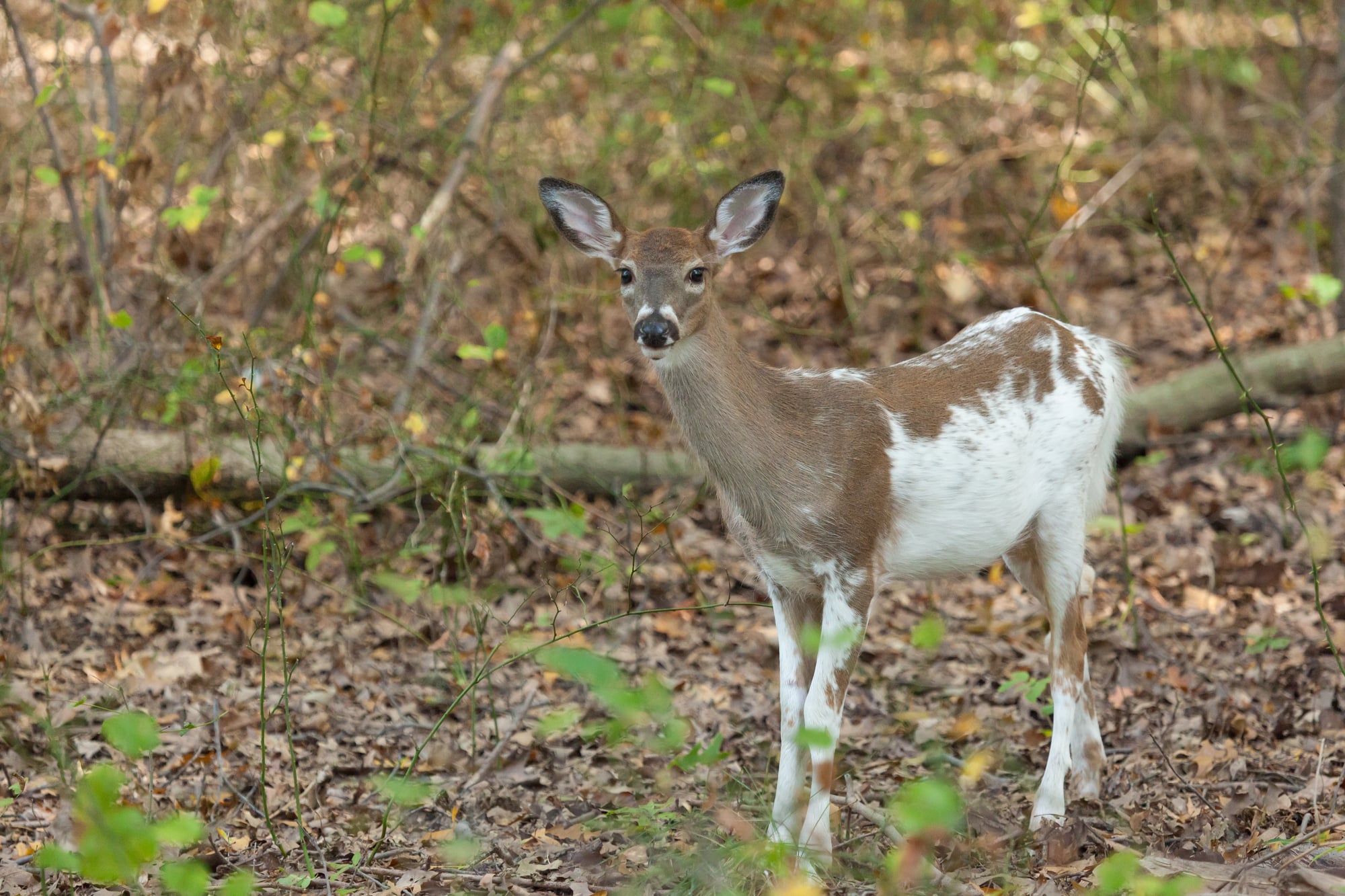 Piebald deer exhibit irregular patches of white across otherwise brown coats. The condition results from partial leucism.