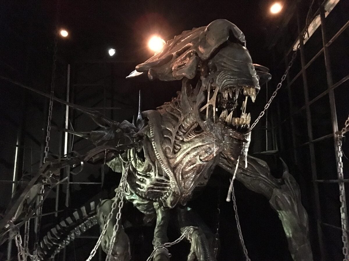 The Alien Queen introduced in Aliens remains one of the most impressive practical creatures ever built for a film. Standing more than fourteen feet tall, the prop required several puppeteers to operate its limbs and head.