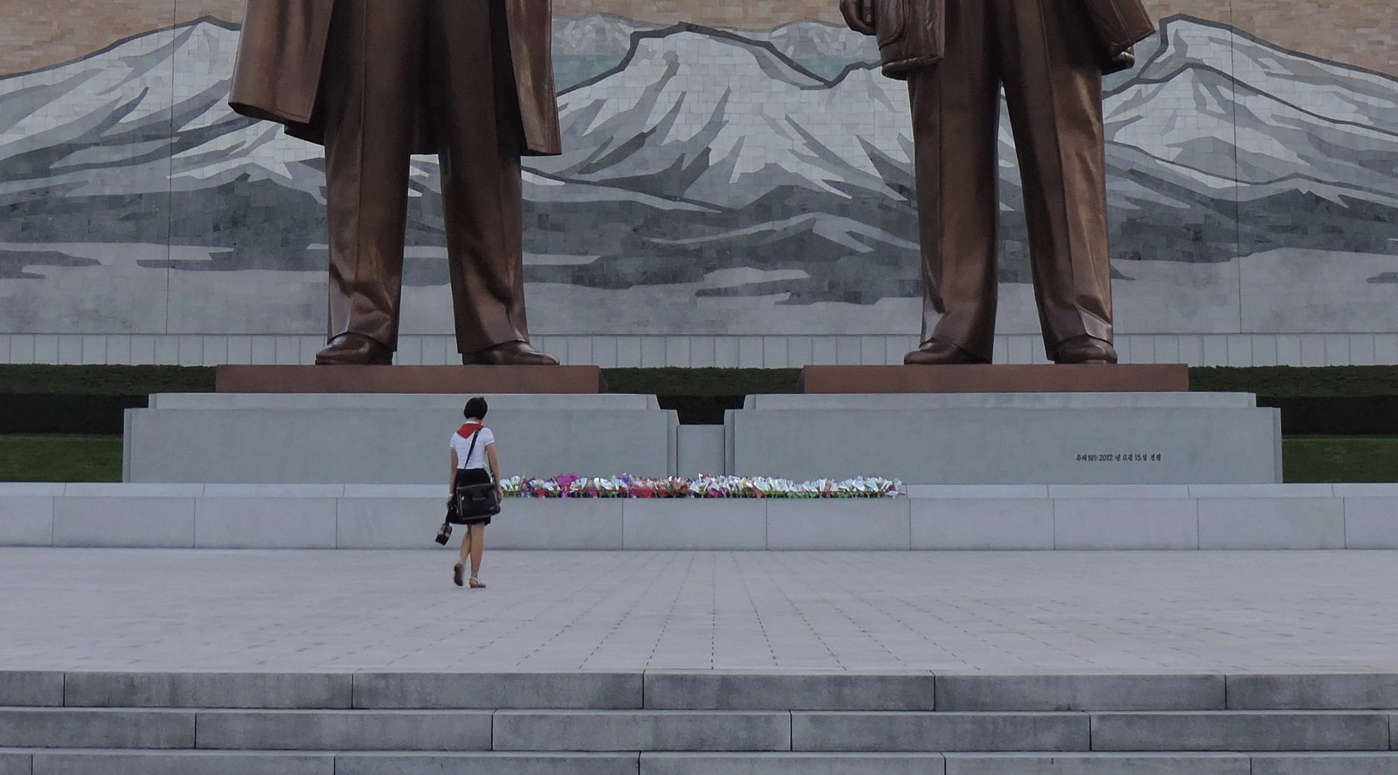 Foreign tourists visiting North Korea are required to bow before the massive statues of Kim Il-sung and Kim Jong-il. Tour guides strictly enforce this rule and watch to ensure visitors show proper respect.