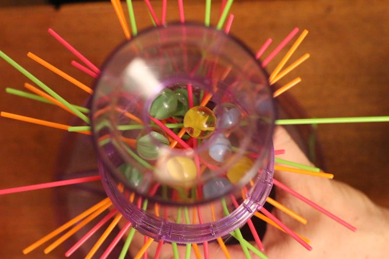The falling marbles in this game drop through a tube and scatter everywhere when the sticks are removed. These marbles roll across floors and become tripping hazards that have caused falls and twisted ankles.