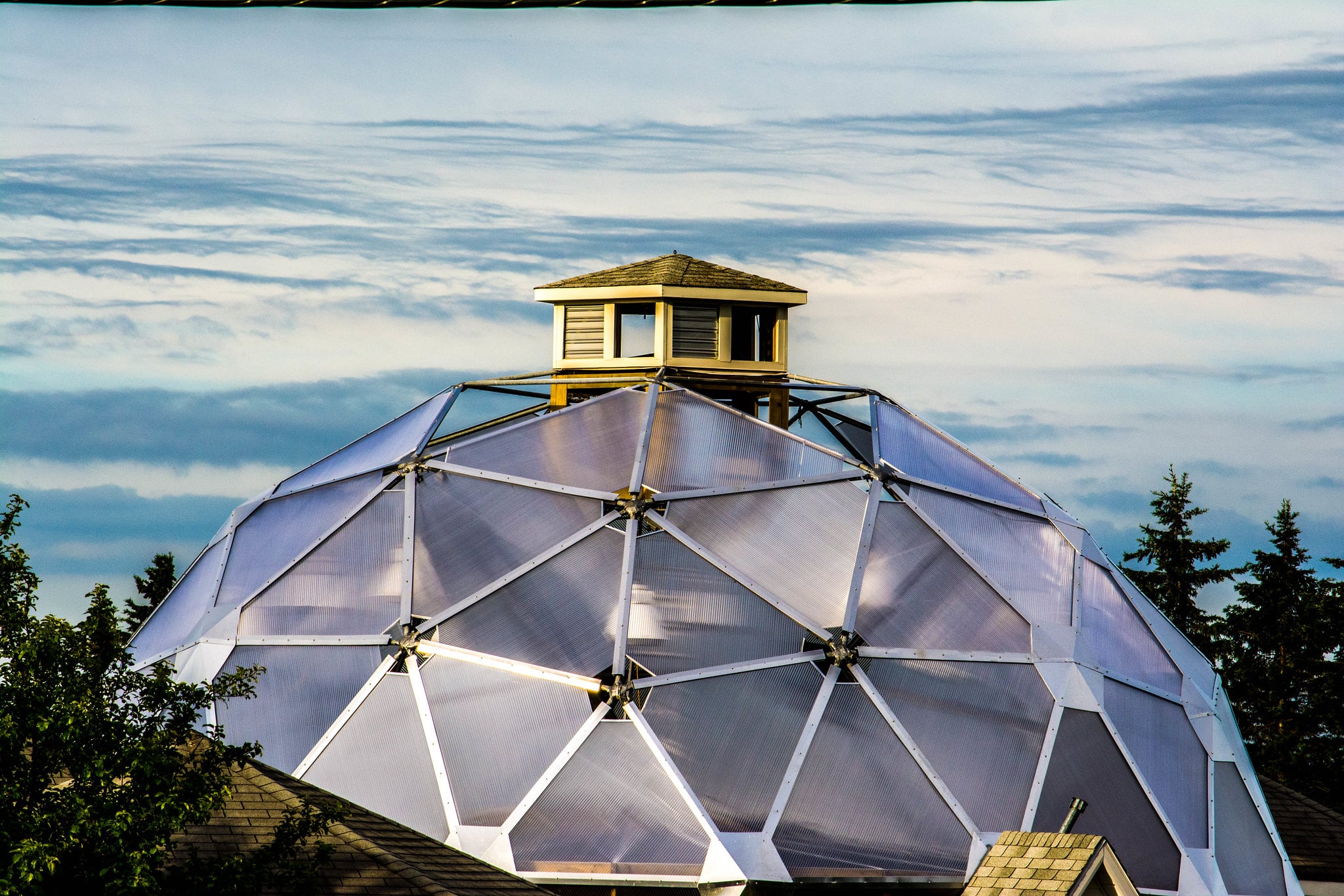 A geodesic dome uses about 20 percent of the material required for a conventional building enclosing the same space, and requires no internal supports regardless of diameter.