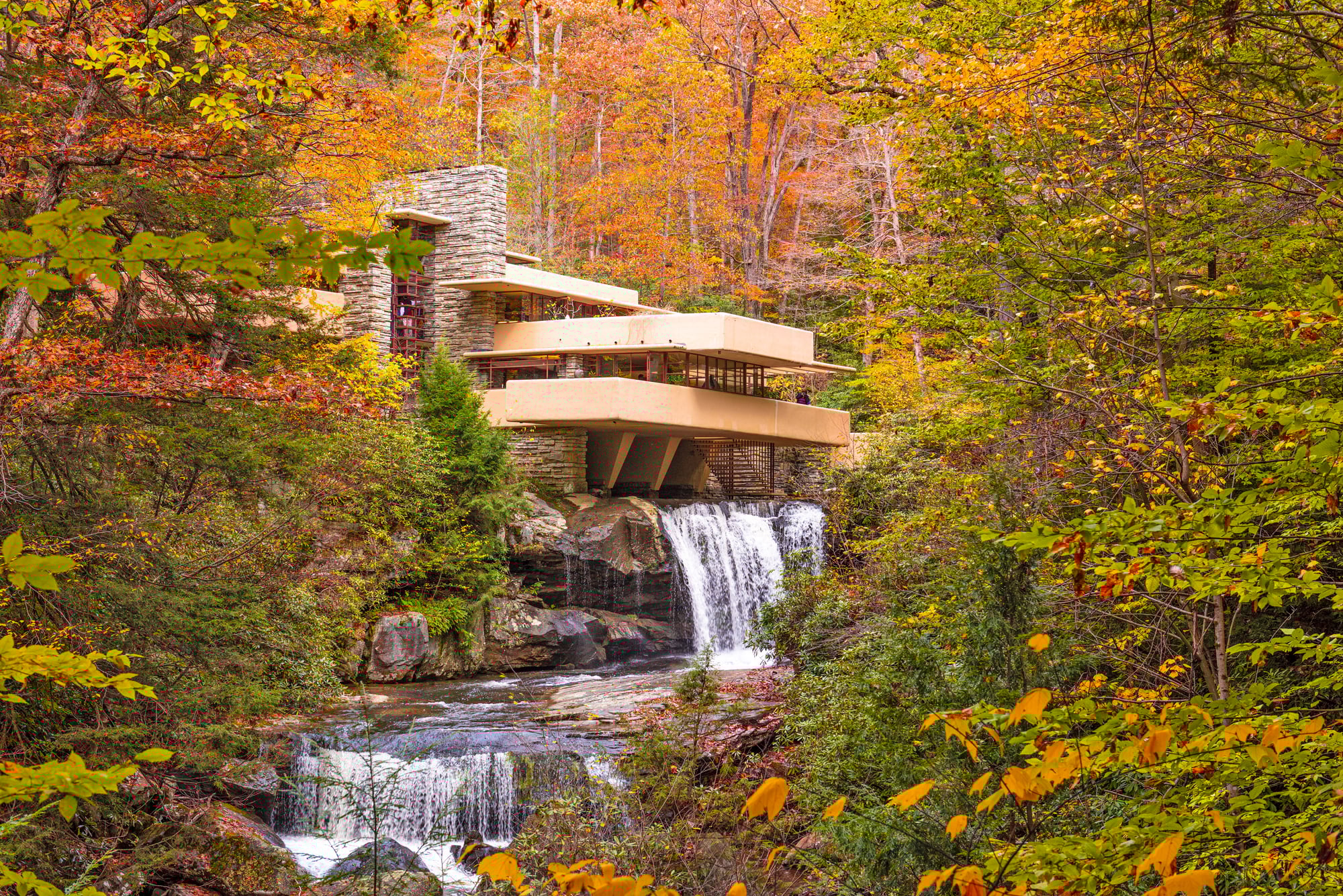 Built directly over a waterfall in rural Pennsylvania, the house features massive concrete terraces that cantilever 15 feet beyond their support columns with no visible means of staying aloft.