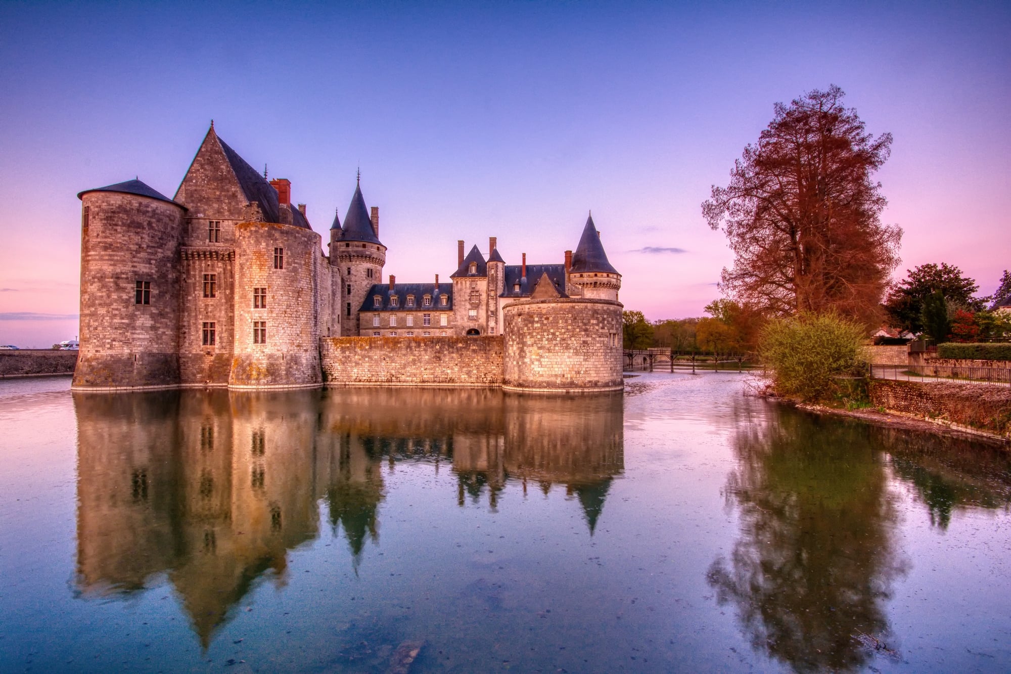Château de Sully-sur-Loire sits within a floodplain, and its moat works in tandem with surrounding waterways. The wide, water-filled channel encircling the castle remains intact and carefully controlled.