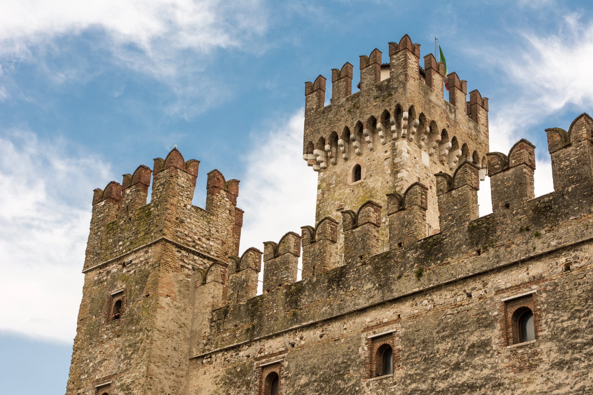 This castle sits directly on Lake Garda, using the lake as a natural extension of its moat system. Water surrounds the structure on multiple sides, remaining deep and actively connected to the wider body of water.