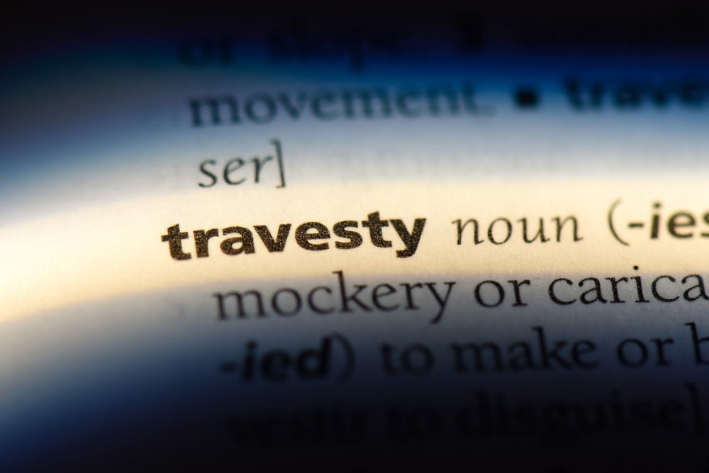 This word gets mixed up with tragedy all the time, but they’re quite different. A travesty is a ridiculous imitation or distortion of something, making a mockery of it.