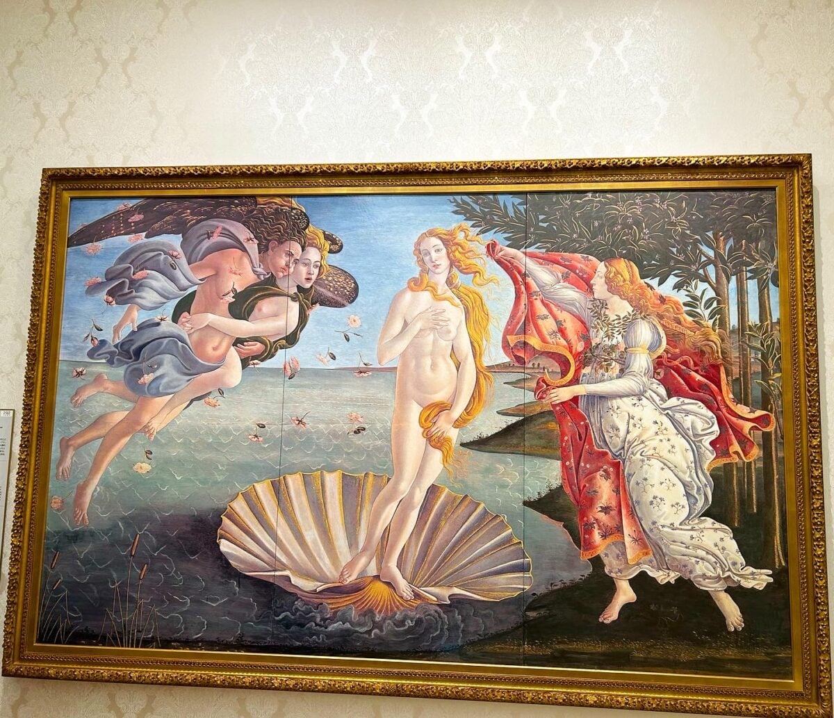 The figure waiting to clothe Venus represents the Hora of spring, symbolizing the renewal and rebirth Venus brings. The painting itself was radical for its time—showing an unclothed classical goddess in an era dominated by Christian art was a bold statement about humanist values returning to Renaissance Florence.
