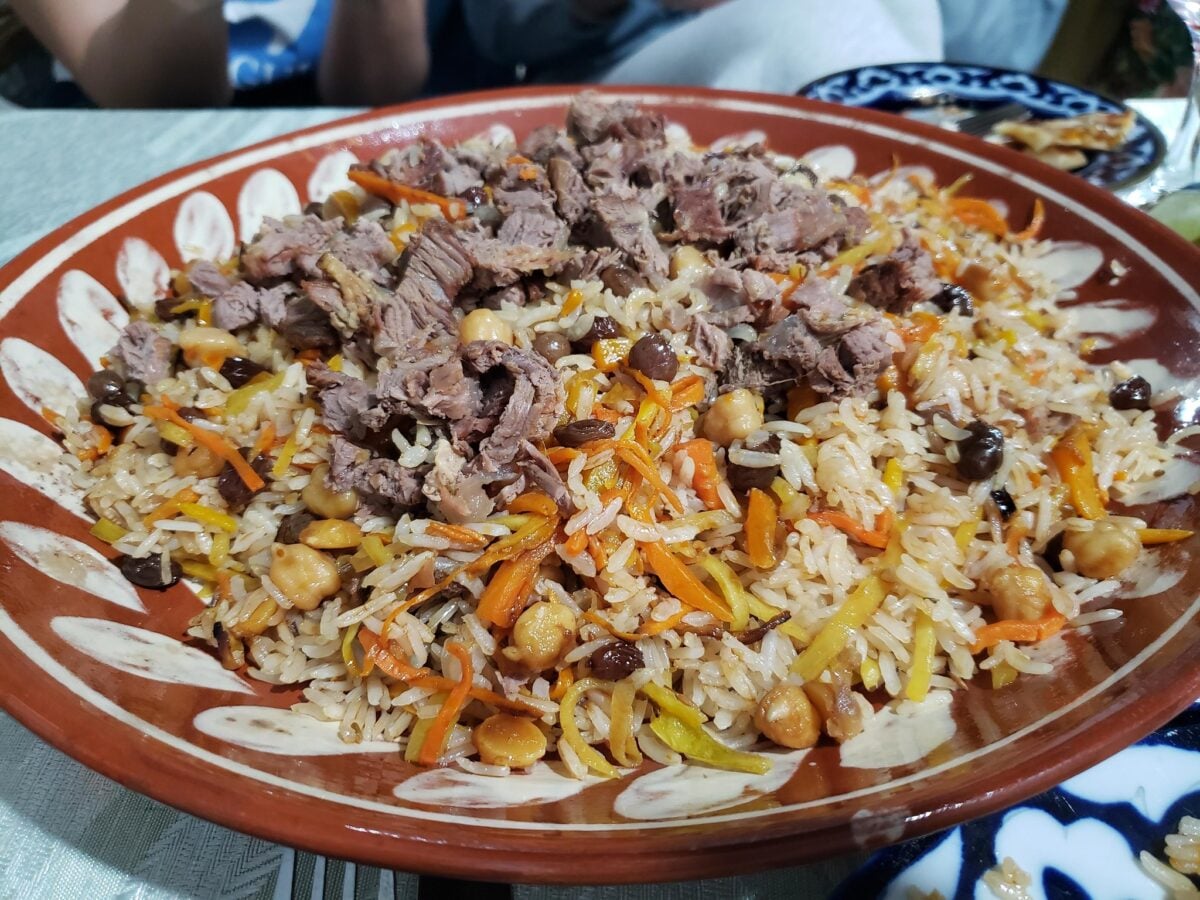 In Uzbekistan, you can eat plov for breakfast, lunch, and dinner—and many people do exactly that. The dish consists of pilaf rice cooked with spices, vegetables, meat, and sometimes raisins or berries in massive pans that can feed hundreds at weddings or funerals.