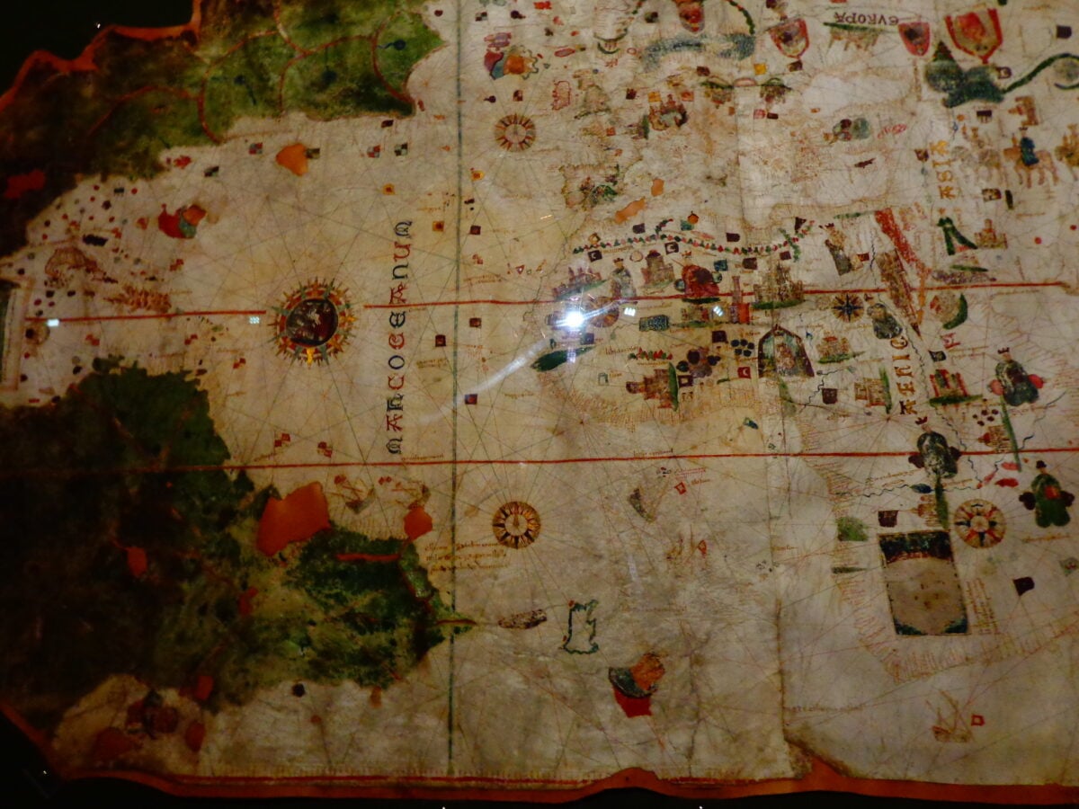 Crafted in 1375 by Abraham Cresques for the King of Aragon, this six-panel masterpiece combined portolan chart accuracy with decorative medieval style. It showed trade routes across Asia, included a depiction of Marco Polo’s travels, and featured detailed information about African kingdoms.