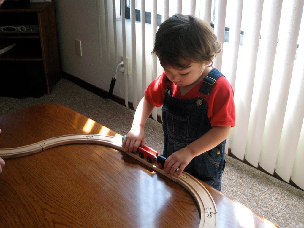 The wooden railway pieces connect to form layouts. They’re compatible with other major toy train brands, which parents appreciate.