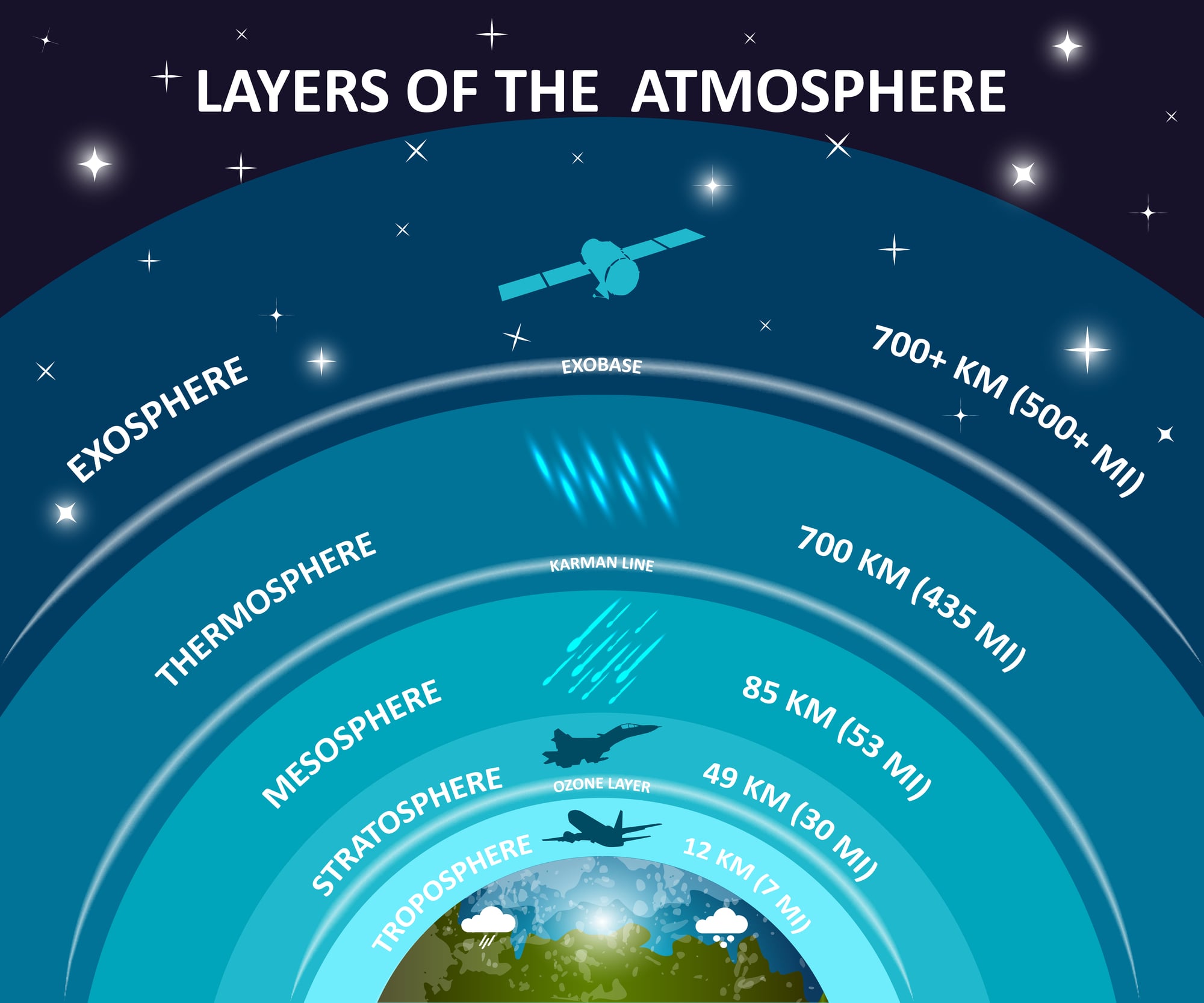 Starting from the ground up, there’s the troposphere, where all weather happens and where we live.