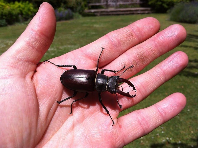 A stag beetle can generate crushing forces with those mandibles that measure many times their body weight. The battles between male stag beetles look dramatic.