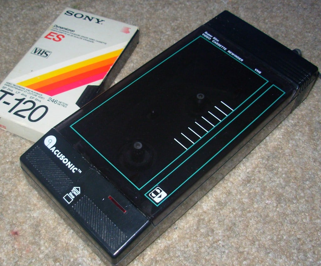 By the late 1980s, rental video stores had become so exasperated with customers returning tapes without rewinding them that they started charging fees — and the market responded by producing a dedicated device whose only purpose was rewinding VHS cassettes. Some were shaped like sports cars or other novelty objects. You plugged a tape in, pressed a button, and the machine rewound it faster than the VCR would, freeing up the player for other use.