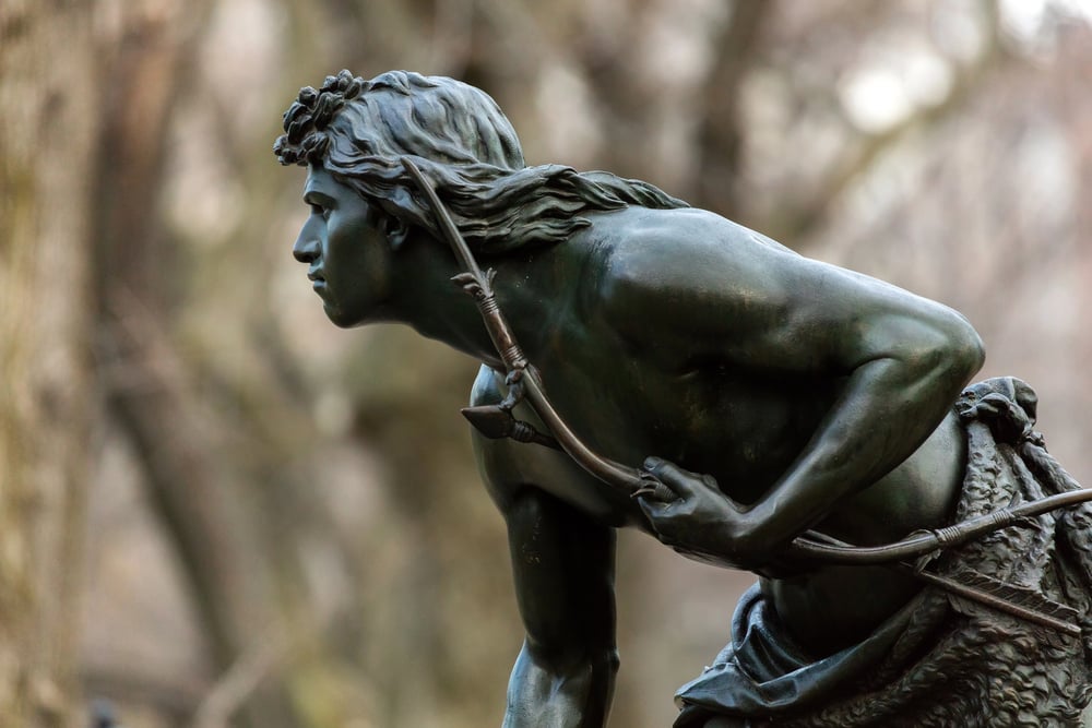 The Indian Hunter statue by John Quincy Adams Ward was completed in 1866, years before Central Park was finished. It originally stood near the Mall but was moved to its current spot near the summit of the East Drive in 1869.