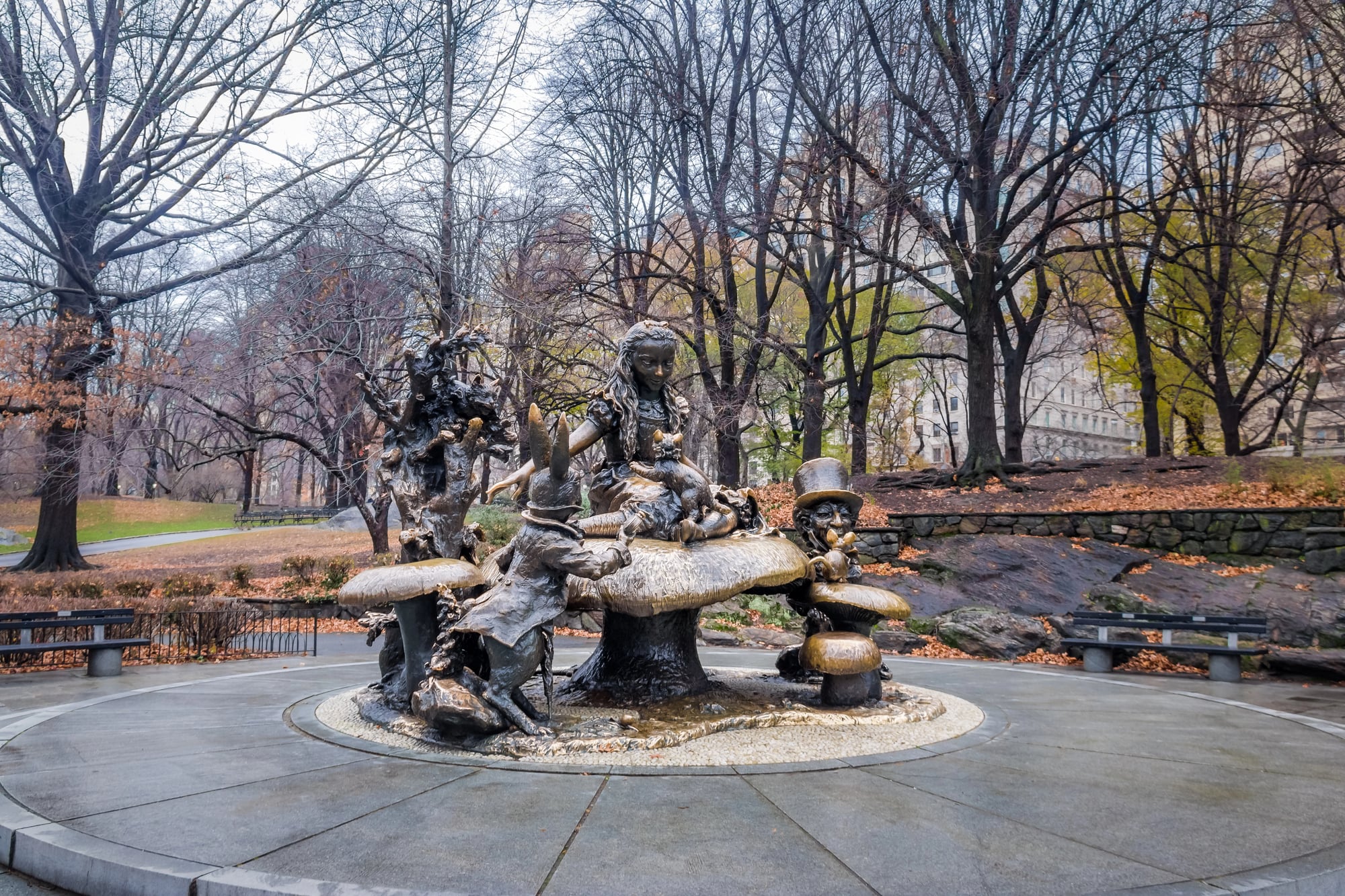 The bronze has been polished smooth by decades of kids scrambling up Alice’s mushroom and sitting in the Mad Hatter’s lap. Philanthropist George Delacorte commissioned the piece as a gift to the city’s children, and he insisted it should be touchable and playful rather than formal.