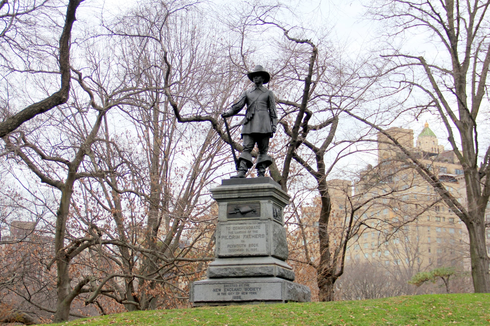 John Quincy Adams Ward’s sculpture by East 72nd captures a Pilgrim stepping ahead, bible tucked under his arm – hinting at faith driving the trip. It points back to Plymouth Rock’s moment in 1620.