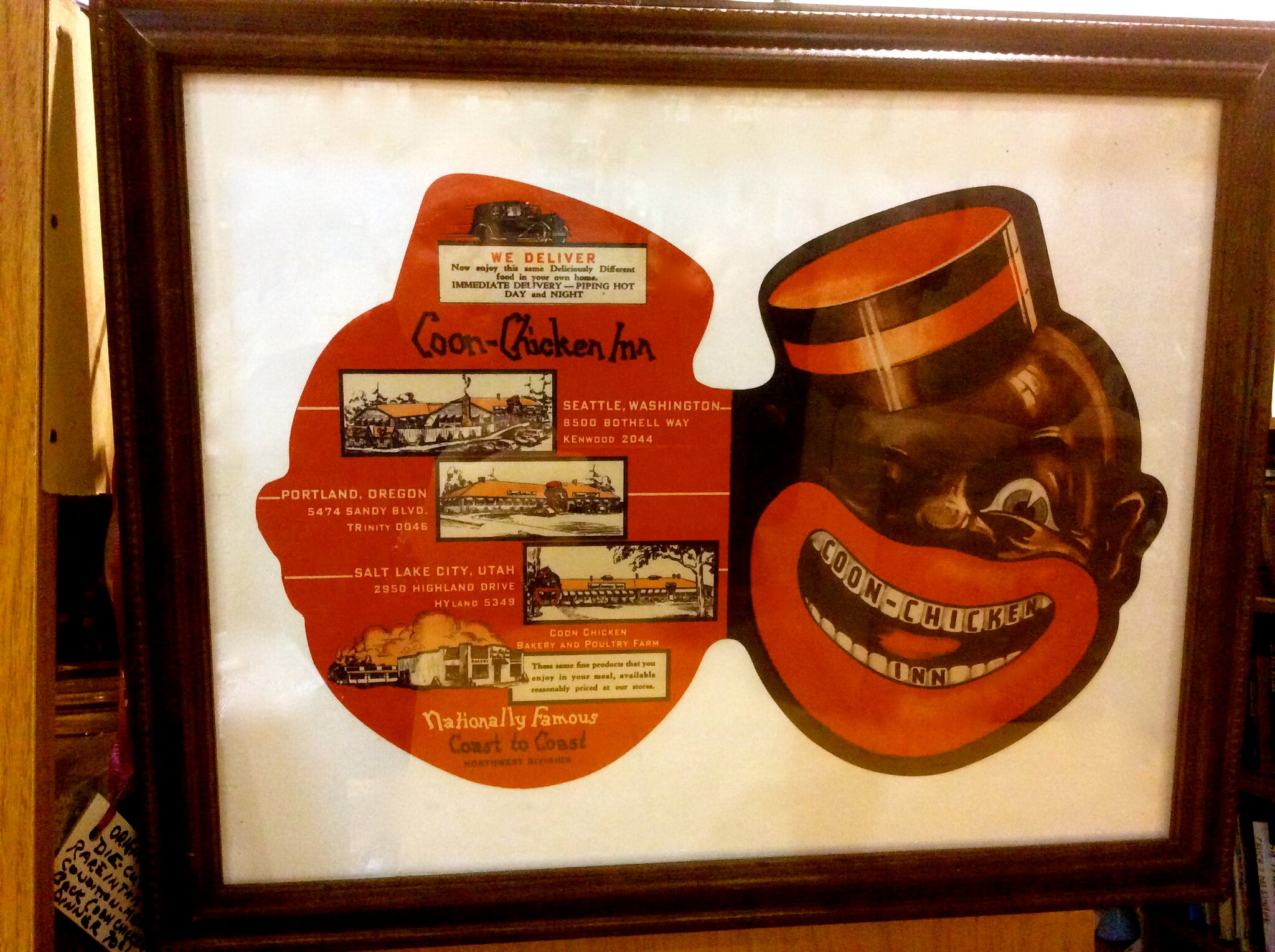 The Coon Chicken Inn ran across the Pacific Northwest between 1925 and 1957. Each location had an entry shaped like a huge, distorted Black face with oversized red lips.