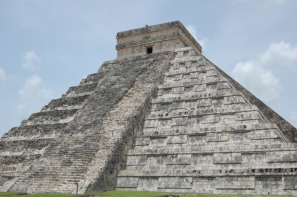 The pyramid at Chichén Itzá — El Castillo, also called the Temple of Kukulcán — was built by the Mayan civilization around the 9th century. During the spring and autumn equinoxes, the setting sun casts a shadow along the staircase that looks like a serpent descending the pyramid.