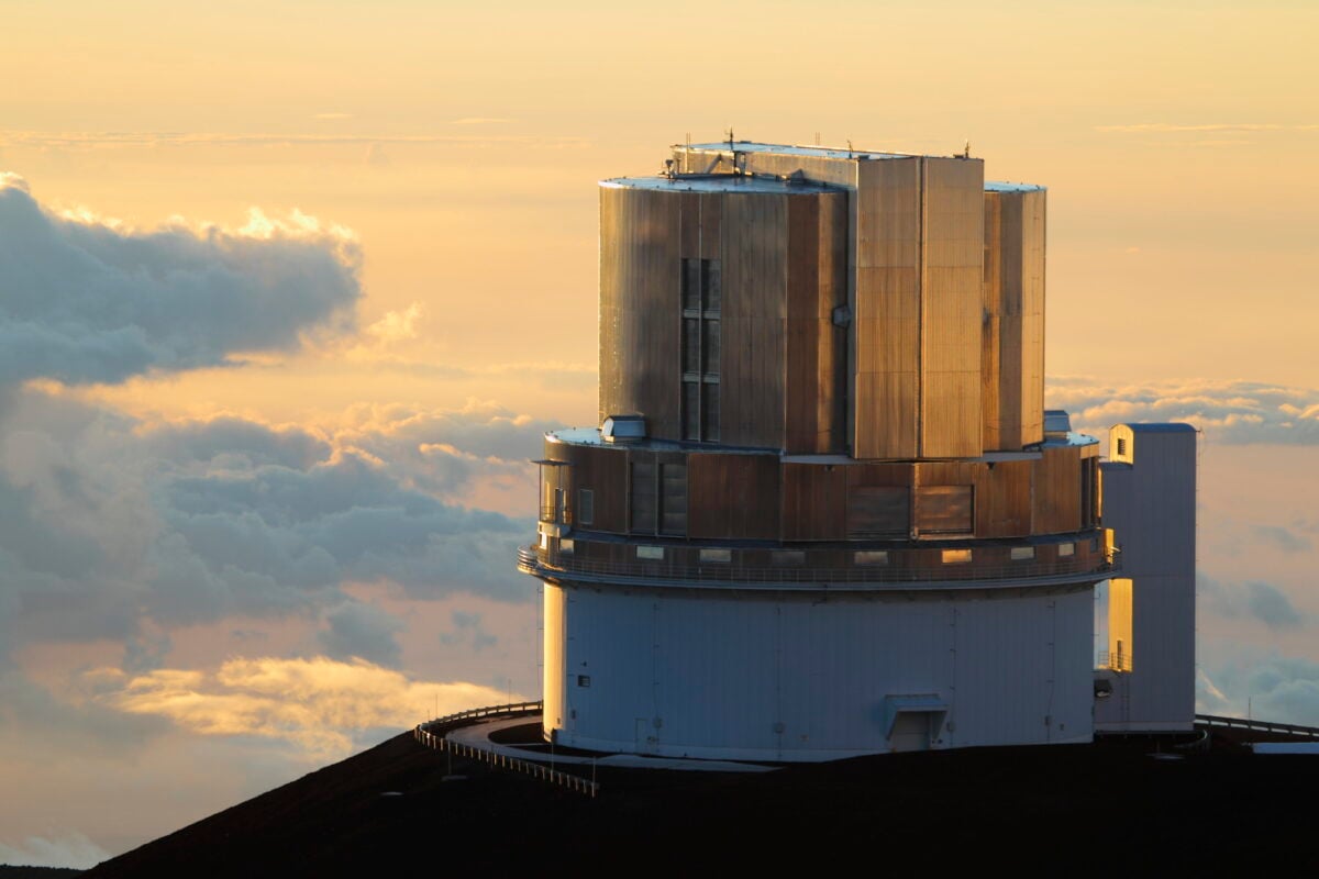 The twin Keck telescopes sit atop Mauna Kea in Hawaii. Each has a 10-meter segmented mirror.