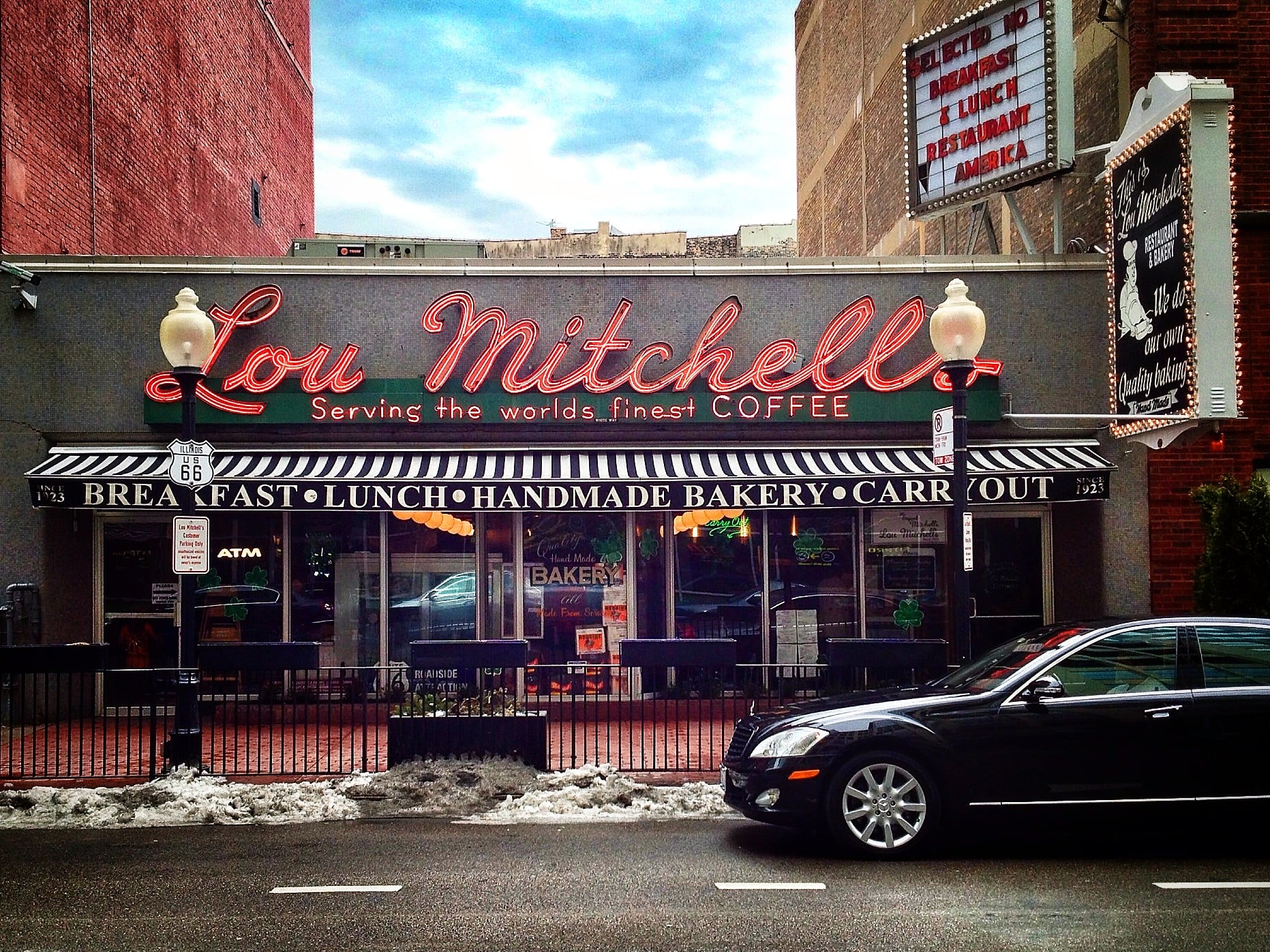 Lou Mitchell’s in Chicago appeared in the comedy film Ferris Bueller’s Day Off. The restaurant, famous for its classic breakfast menu, has been serving customers along Route 66 since 1923.