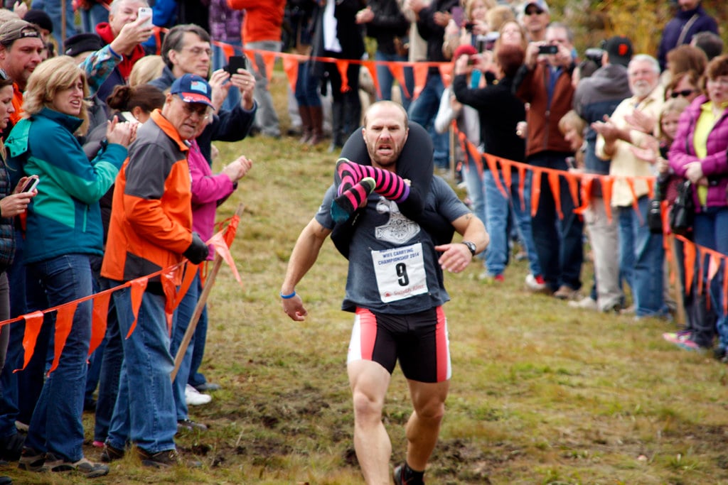 Men race through an obstacle course while carrying a woman—traditionally their wife, though the rules now allow any female partner. The track includes water hazards, sand pits, and hurdles.