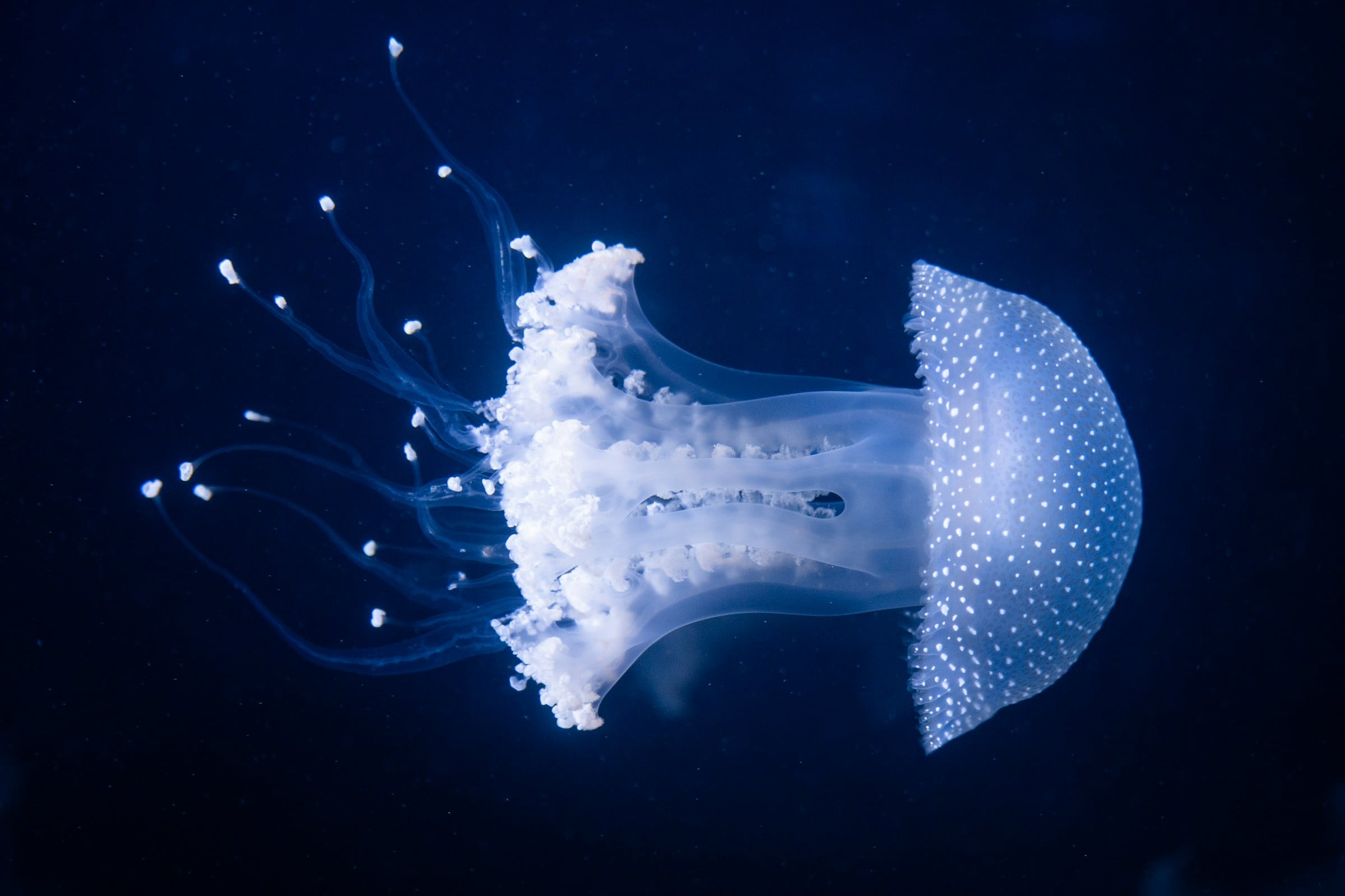 The jelly uses its trailing arms to catch prey and propels itself through the pitch-black depths with periodic pulses from its faintly glowing bell.