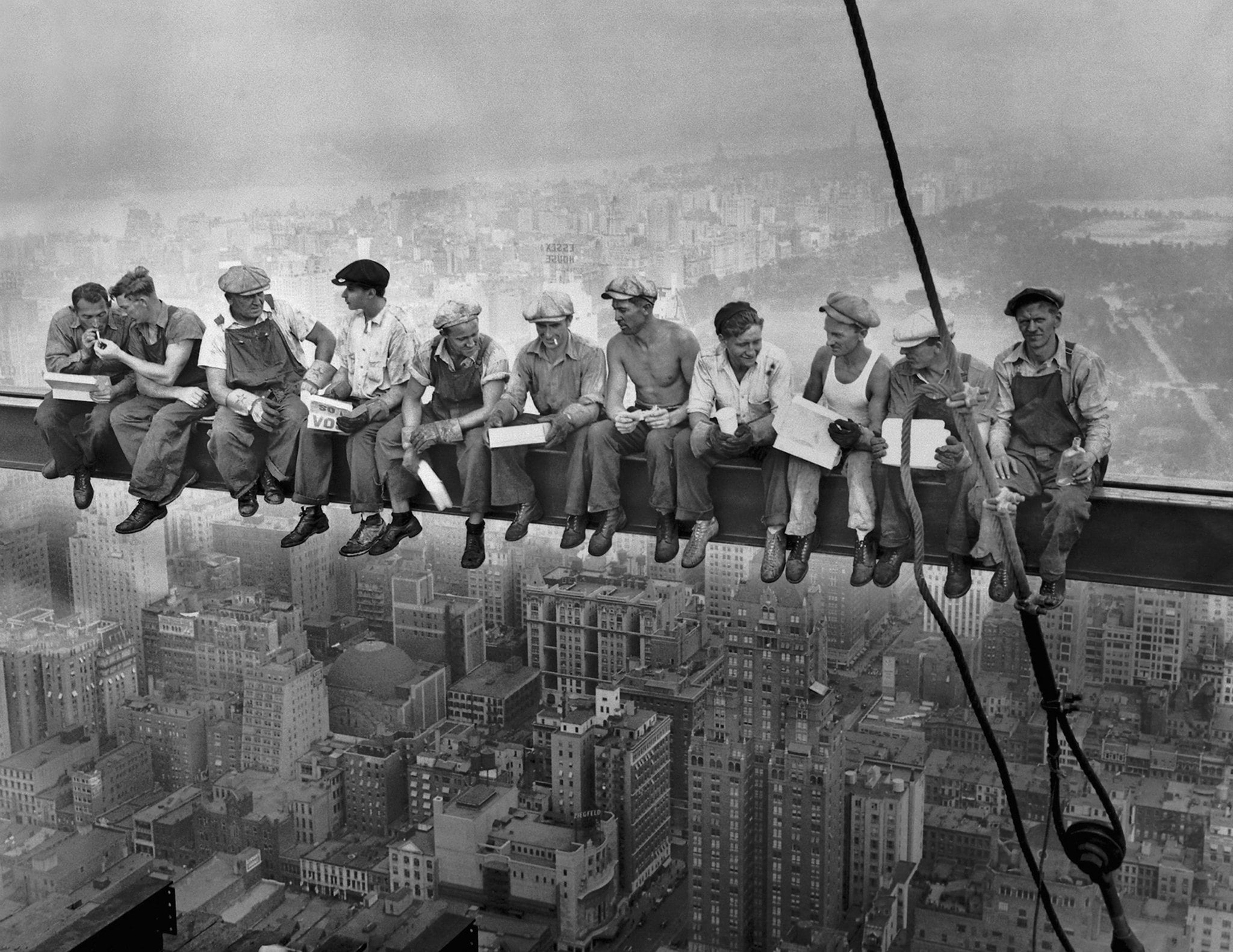 Charles Ebbets captured eleven construction workers eating lunch on a steel beam suspended hundreds of feet above Manhattan in 1932. The men sit casually on the beam with no safety equipment, their legs dangling over empty space.