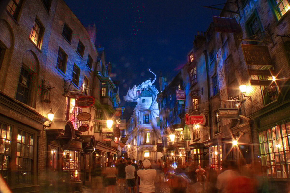 Shops stacked impossibly high, selling everything from wands to wizarding candy that actually makes you roar like a lion.