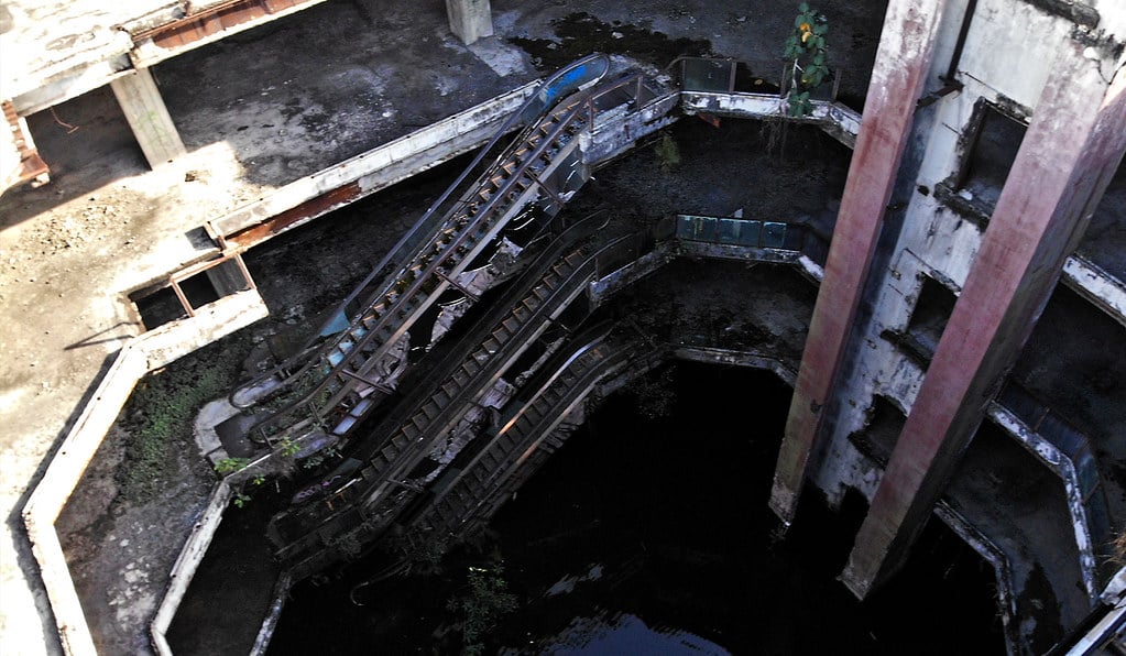 The escalators still work, somehow. You can ride them up from the flooded basement to the upper floors, where empty storefronts remind you what this place used to be before it became something completely different.
