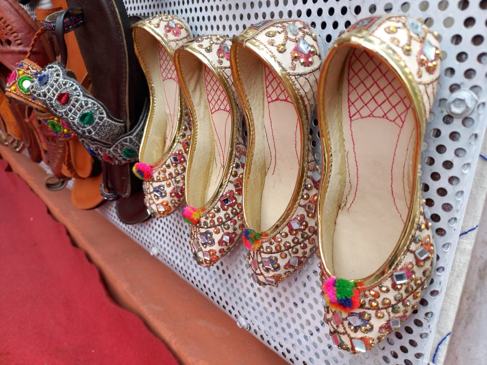 Mojari shoes curl upward at the toe like something from a fairy tale, their pointed tips reaching toward the sky with an optimism that seems to defy gravity. The embroidery that covers them tells stories in thread — peacocks and paisleys, flowers and geometric patterns that shimmer with gold and silver threads.