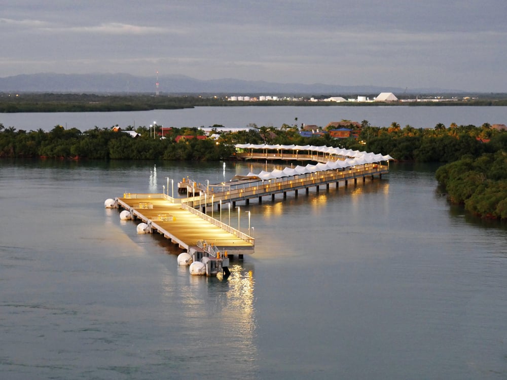 Harvest Caye, developed by Norwegian Cruise Line in Belize, operates as a purpose-built cruise destination connected to the mainland by a pier. The port area features a large pool complex, a saltwater lagoon, and manicured beach sections reserved for cruise guests.