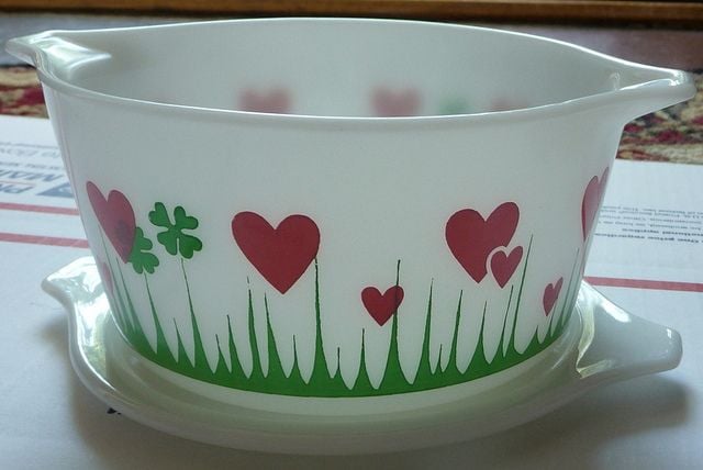 The Lucky in Love pattern features pink hearts on white Pyrex, and collectors consider it one of the holy grails. Corning produced this pattern for a very short time in the 1950s, primarily as promotional items.