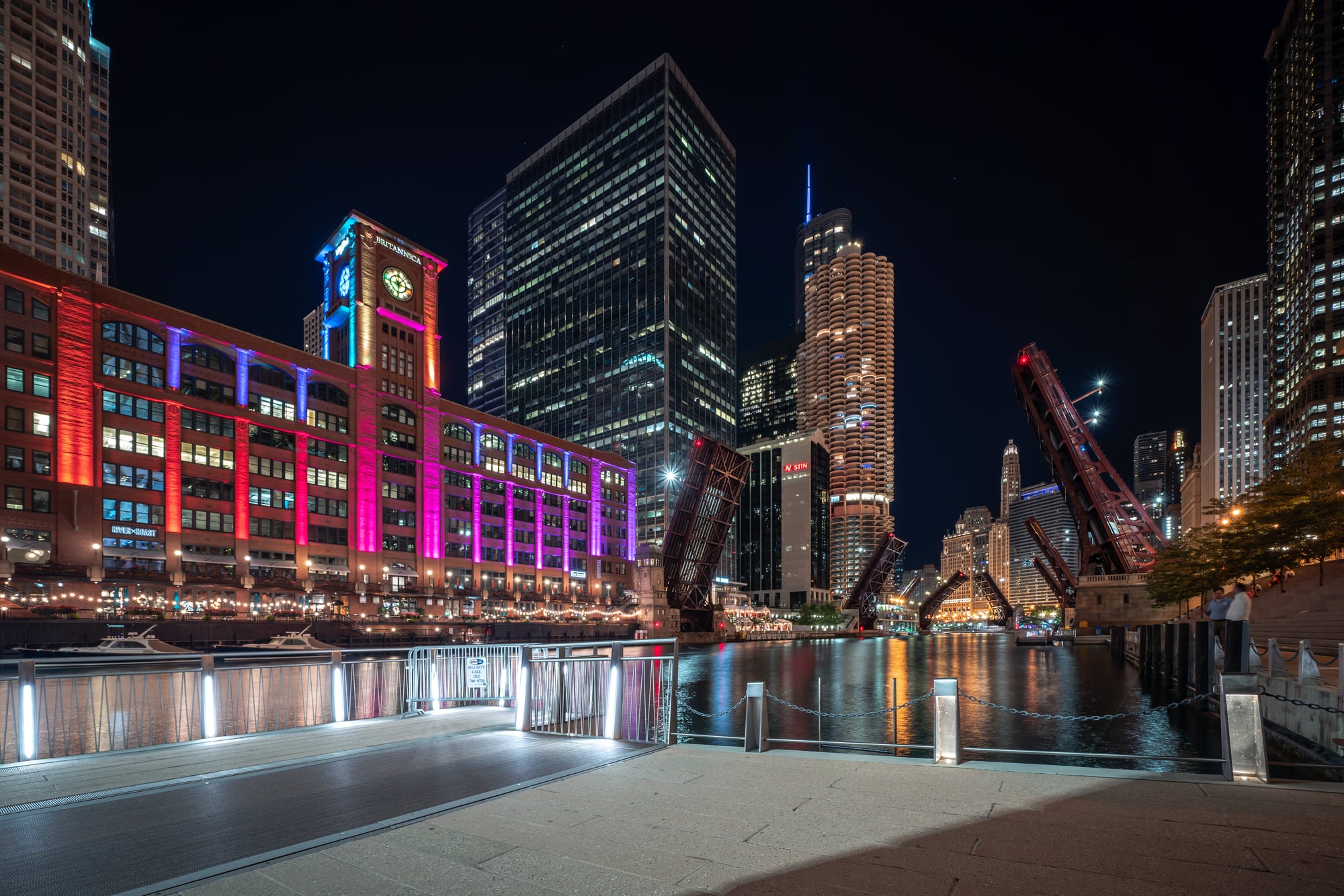 Each tower originally contained 449 apartments, though the exact number varies today after condo conversions and renovations, with the lower 19 stories dedicated to parking—necessary when the complex was built to convince suburban residents to return to downtown living. The complex includes a theater, restaurants, a bowling alley, and a marina with berths for resident boats.