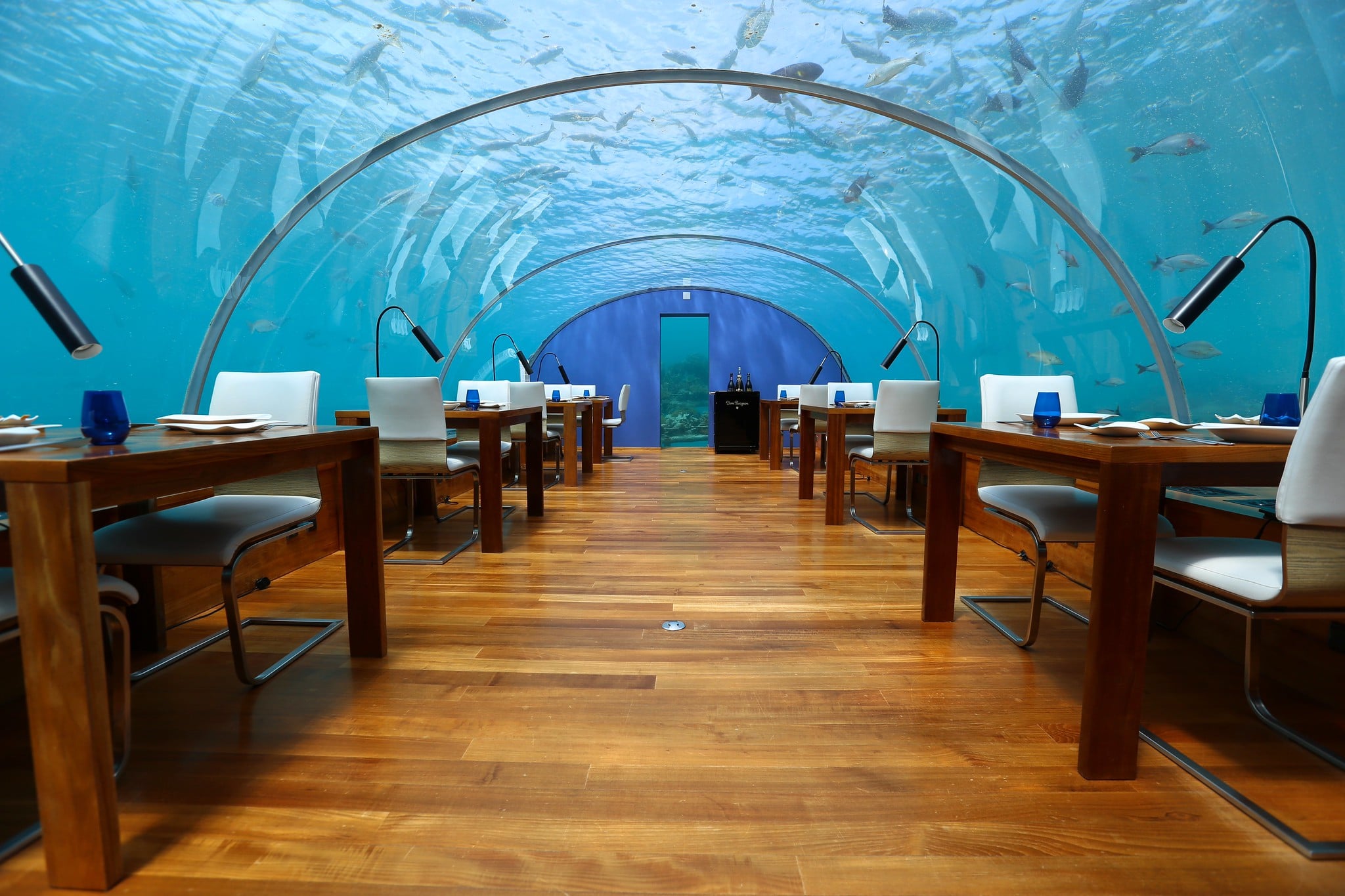 Underwater dining rooms where fish swim past your table.