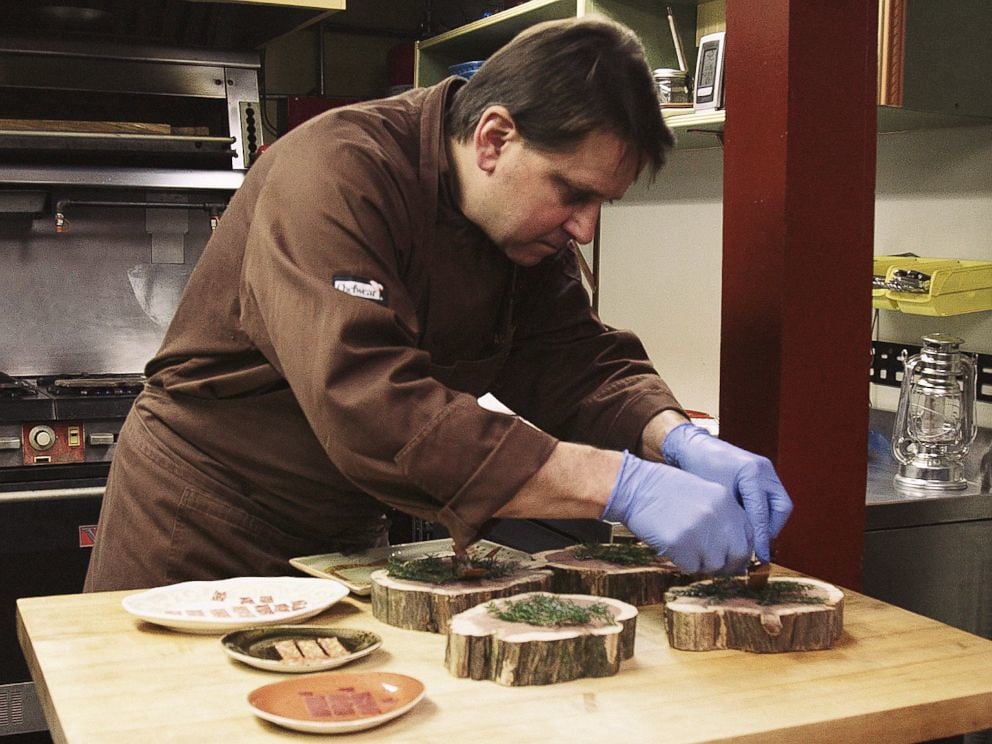 He makes his own flours from pine and acorn, creates oils from foraged nuts, and cures meats using pine needle juice instead of traditional methods.