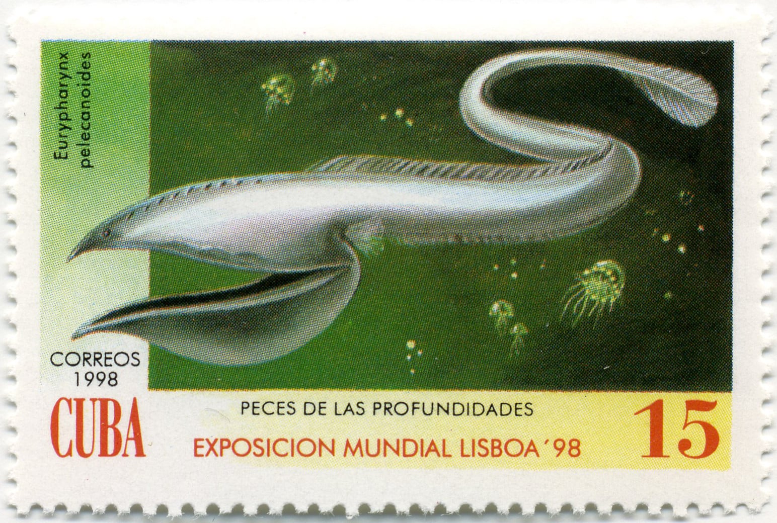 The mouth extends into a huge pouch that can balloon out to catch prey. The tiny body attached to this enormous mouth ends in a whip-like tail with a light organ.