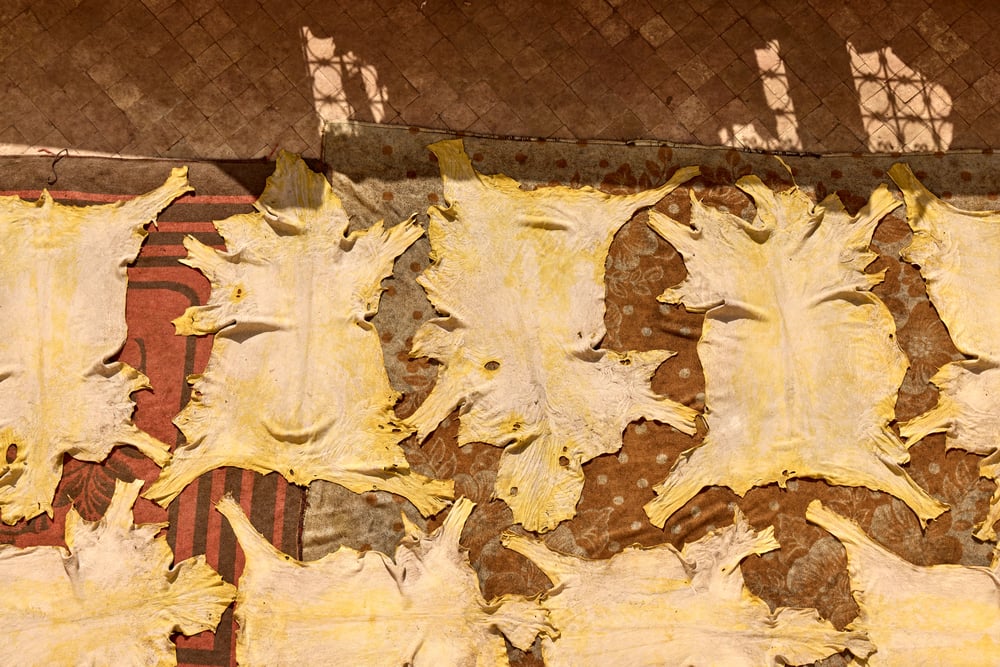 Fresh hides must be treated within hours of arriving at the tannery to prevent decomposition. Workers cover them in thick layers of salt that draw out moisture and halt bacterial growth.