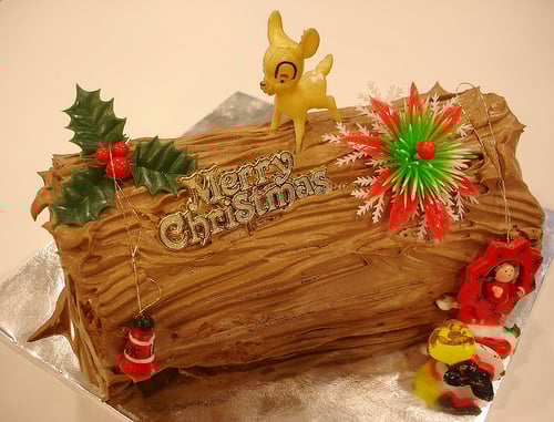 The Yule log dessert mimics an older tradition of burning large logs during winter solstice celebrations. Northern European families selected massive logs, decorated them, and kept them burning throughout the twelve days of Christmas.