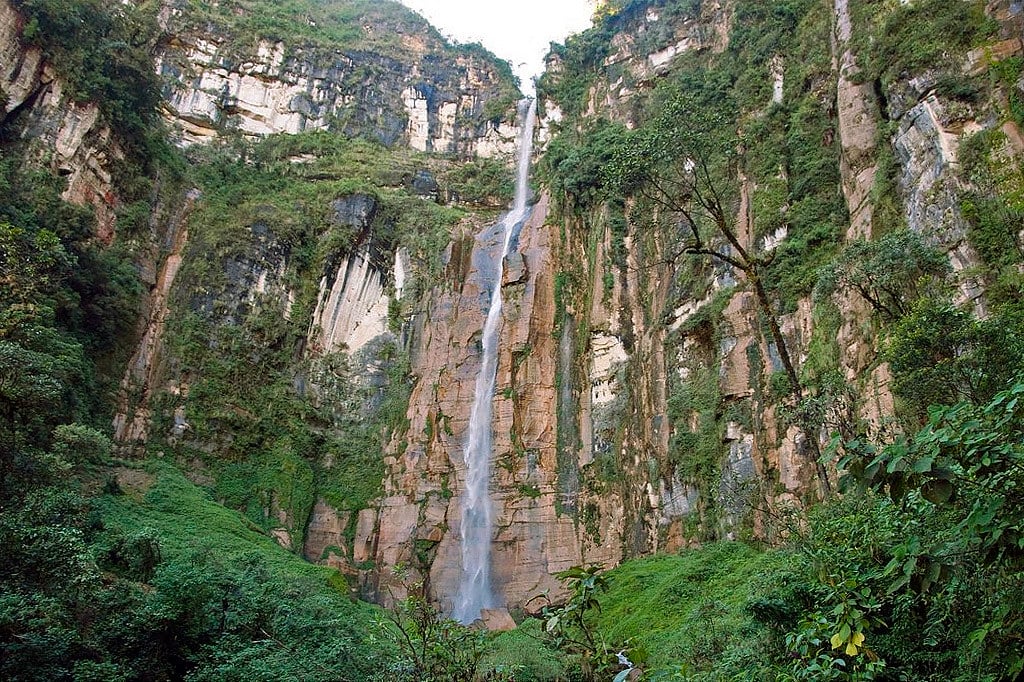 Catarata Yumbilla in Peru measures approximately 896 meters tall. The waterfall drops in four distinct tiers through the cloud forest near the village of Cuispes.