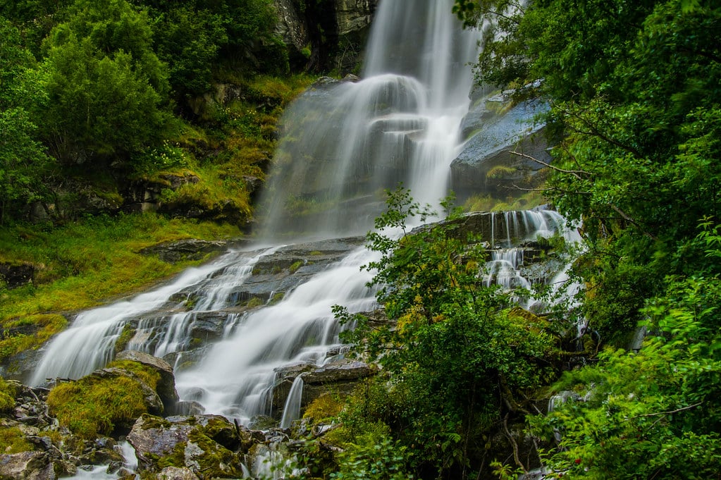Norway’s Vinnufossen drops 865 meters in a series of cascades and free falls. The waterfall receives meltwater from the Vinnufonna glacier, meaning it flows strongest during summer when the glacier melts rapidly.