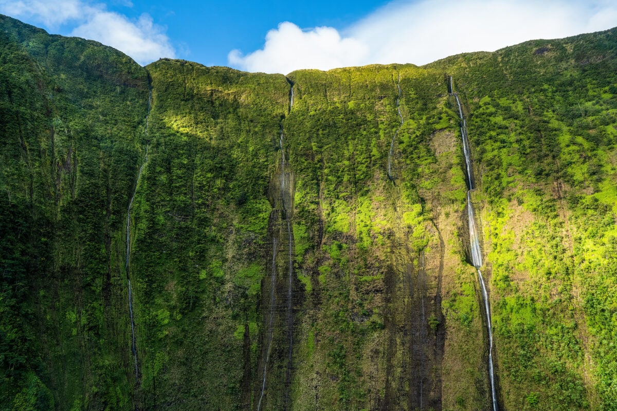 The cliff sits on the northeastern coast of Molokai, part of the tallest sea cliffs in the world. The only way to see Olo’upena properly is from a helicopter or boat.