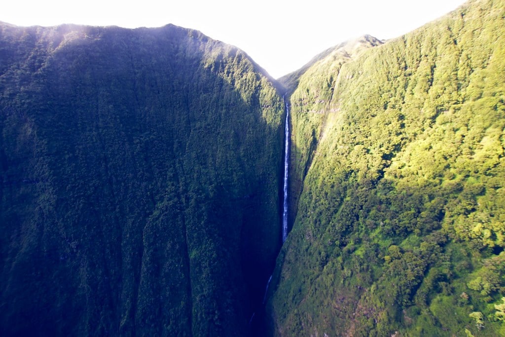 Hawaii’s Pu’uka’oku Falls on Molokai drops 840 meters, making it the second-tallest waterfall in Hawaii after Olo’upena. Like its taller neighbor, the falls flow only after significant rainfall and can only be seen from helicopters or boats.