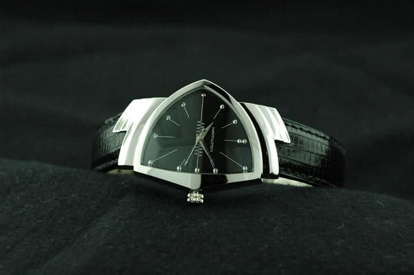 The Ventura is one of the most distinctive watch designs ever made — a triangular case that looks like it landed from another decade, which is exactly why it worked so well in Men in Black. Will Smith’s Agent J wore it throughout the film, and the anachronistic shape fit the movie’s tone perfectly.