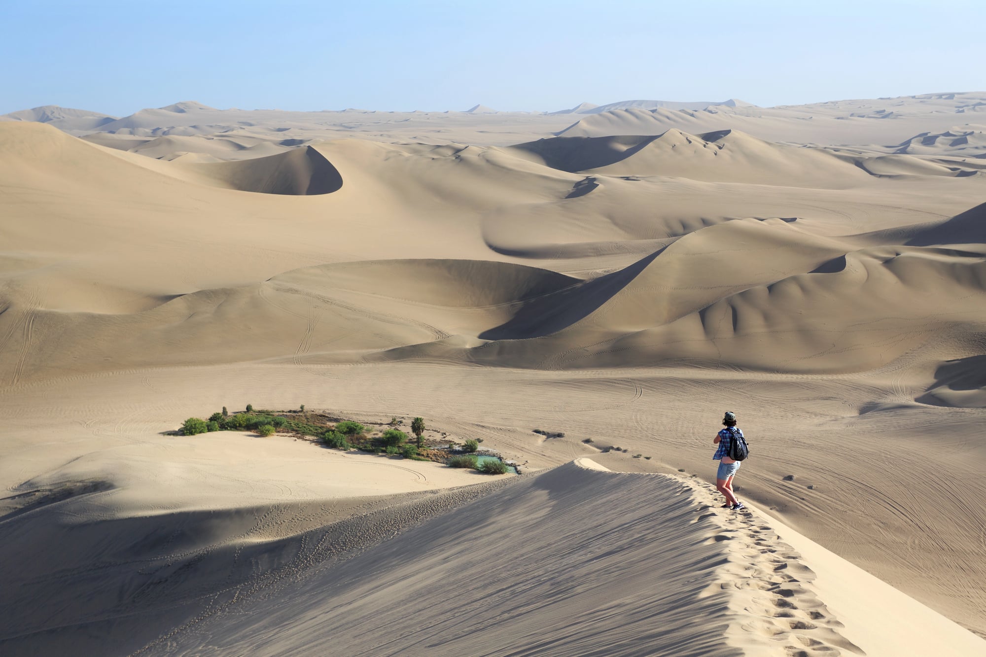 Huacachina appears suddenly in Peru’s coastal desert, a small lagoon encircled by towering dunes. Palm trees cluster tightly around the water, while sand rises steeply on all sides.