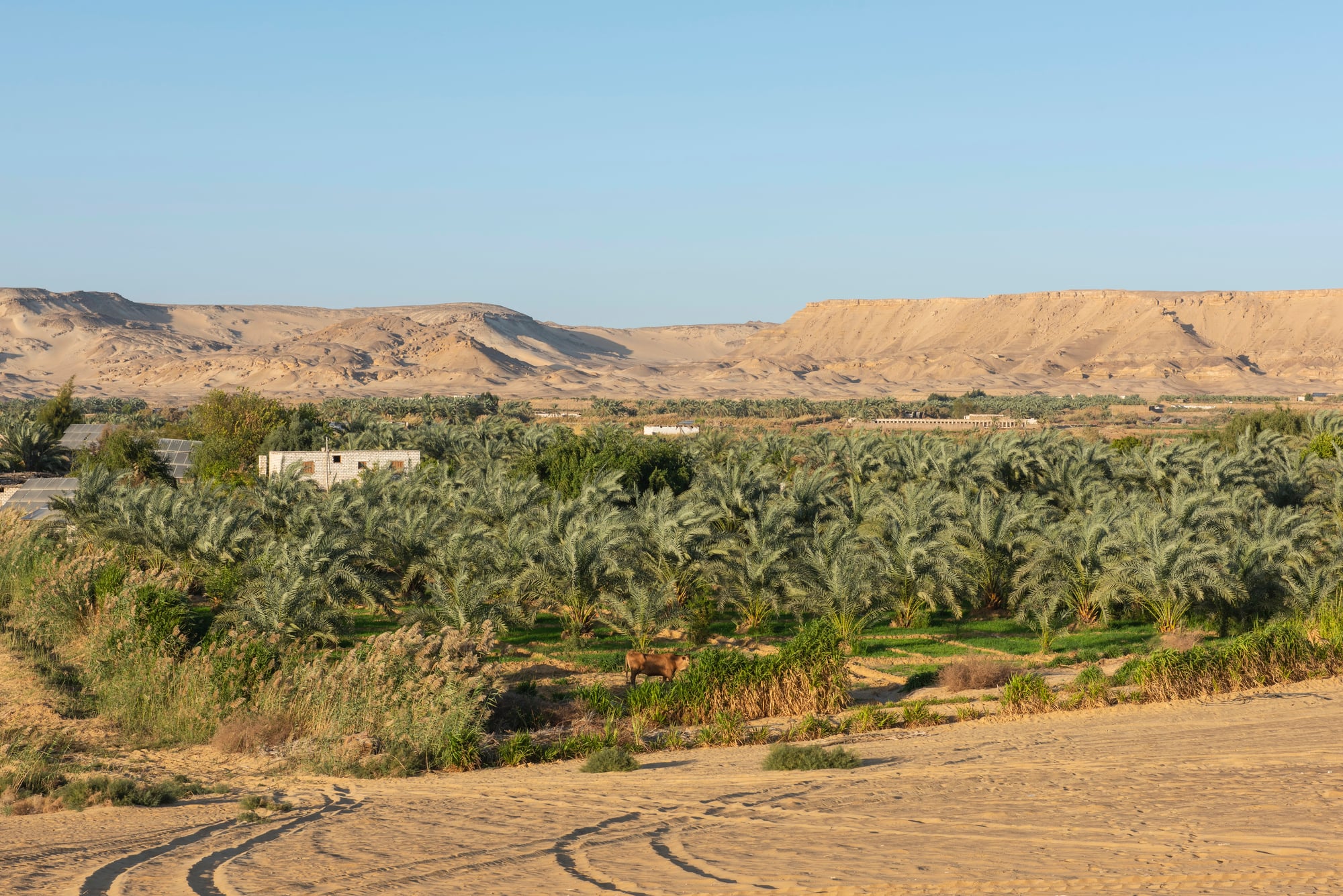 Bahariya Oasis is surrounded by black volcanic hills and sandy plains. Springs feed palm groves and farms, while villages cluster near water sources.